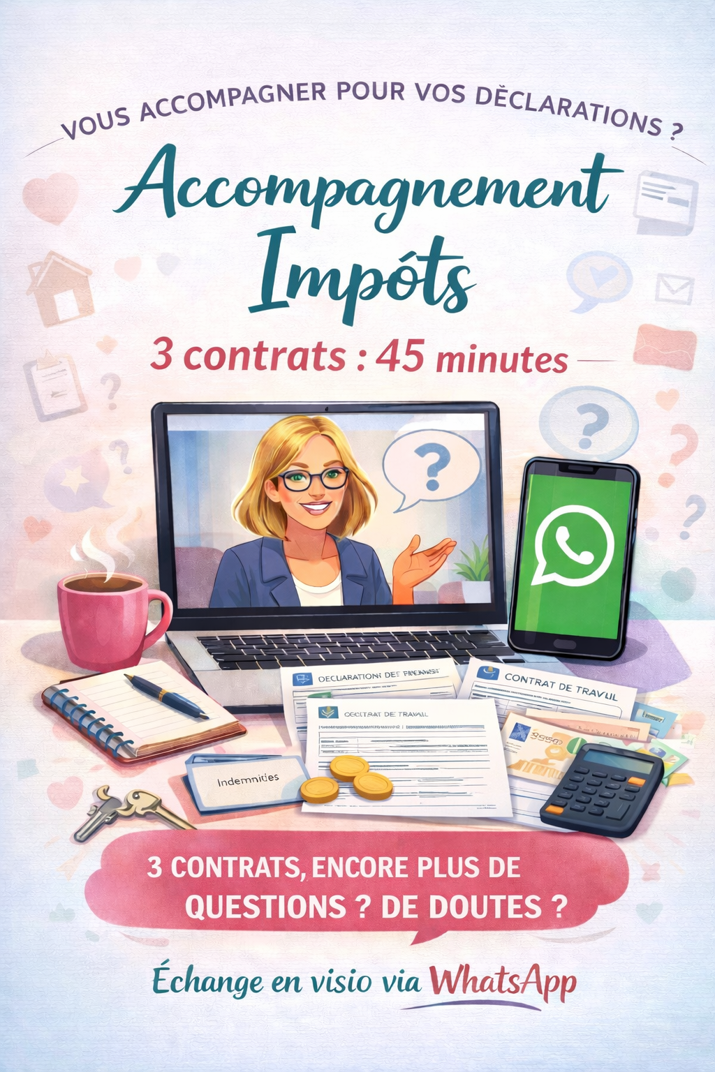 Je vous appelle en visio sur WhatsApp pour le calcul des impôts de 3 contrats, d’une durée de 45 minutes sur rendez-vous.
